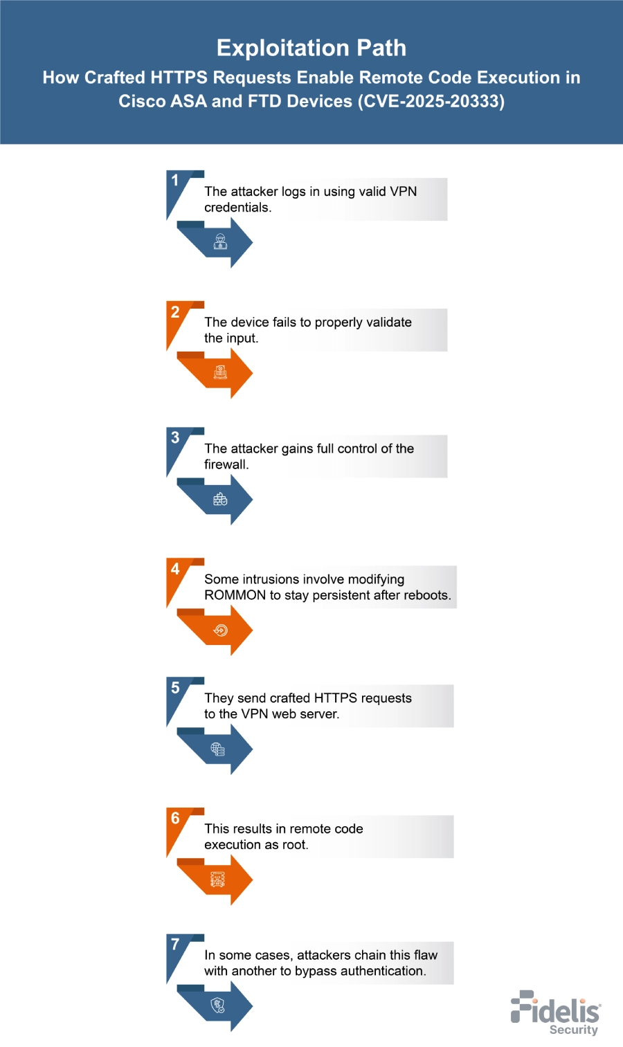 Patch application impact: Fixing CVE-2025-20333 requires upgrading ASA and FTD devices. With no workarounds available, the patch must be applied directly on perimeter firewalls, which may cause brief VPN or traffic interruptions. After updating, devices should be reviewed to ensure they’re clean and operating correctly.